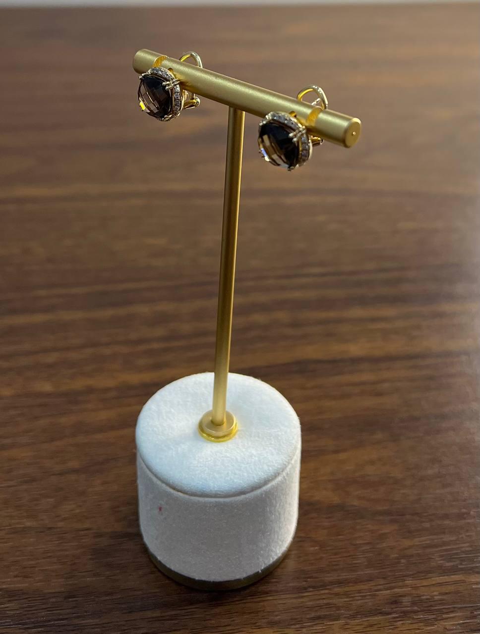 Discover the elegance of these quartz and diamond earrings. Featuring 6.38 carats of round brown smoky quartz, these earrings captivate with their clarity. Accented by 0.24 carats of white diamonds, graded H in color, they add a touch of brilliance. Crafted in 14k yellow gold, these earrings embody sophistication.