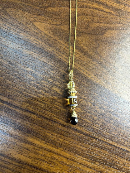 Features a vertical arrangement of intricate elements, including a clear faceted bead, a gold-toned cylindrical piece, and a black teardrop-shaped Smoky Brown Yellow Quartz Orange Citrine. Accented with delicate metalwork and sparkling embellishments in 14K Yellow Gold.