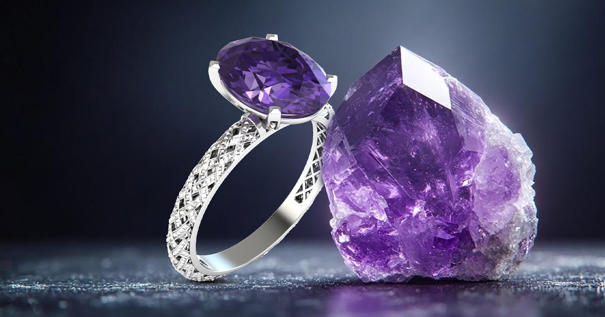 Кольцо из белого золота 14 карат с круглым фиолетовым аметистом и белым бриллиантом